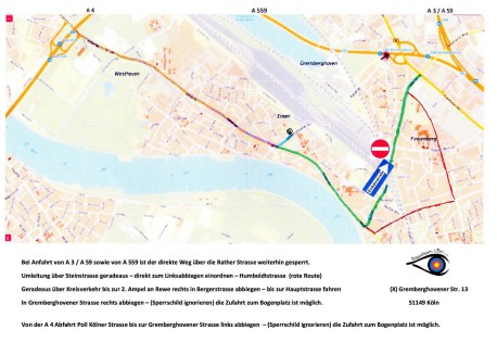 Bei Anfahrt von A 3 / A 59 sowie von der A 559 ist der direkte Weg über die Rather Strasse gesperrt.
