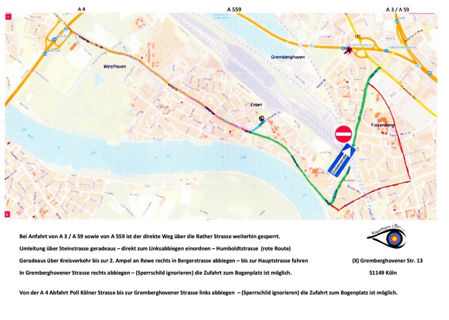 Von der A 4 Abfahrt Poll Kölner Strasse bis zur Gremberghovener Strasse links abbiegen – (Sperrschild ignorieren) die Zufahrt zum Bogenplatz ist möglich.
